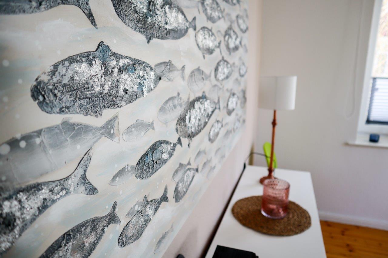 Zur Ausstattung gehören: Dusche & WC, Elternschlafzimmer mit Boxspringbett und Blick auf den Deich, Kinderzimmer mit 2 Einzelbetten, vollausgestattete Küche mit Terrasse und hochwertigen Gartenmöbeln sowie Strandkörben, Wohn-Essbereich mit komfortabler Schlafcouch und Ofen, TV, kostenfreies W- LAN, Waschmaschine, Parkplatz direkt am Haus. Das Elternschlafzimmer mit einem Boxspringbett, sowie das Kinderzimmer mit zwei Einzelbetten und der Wohnbereich mit einer komfortablen Schlafcouch laden zum gemütlichen Schlafen ein.